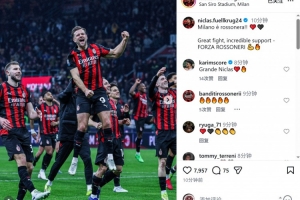 菲尔克鲁格此役为米兰替补出场,赛后他在社交媒体上晒出庆祝的照片,配文:“米兰是红黑色的!”