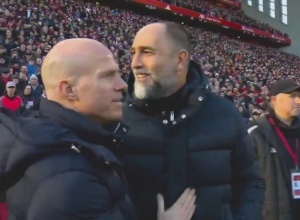 转播镜头显示,比赛开始前,图多尔出现在安菲尔德场边,他走向一个穿着深色外套,双臂交叉的人面前,拍了拍他的肩膀,打招呼并与他握手——可能认为对方是斯洛特。
