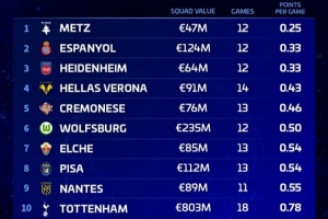 体育资讯3月24日讯 德国转会市场统计了2026年五大联赛球队场均积分最低的Top10,法甲的梅斯0.25分最少。