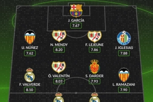 Whoscored评本轮西甲最佳阵:维尼修斯领衔,巴尔韦德、霍安在列