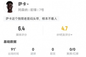 萨卡本场5射2正+2关键传球 23丢失球权+22对抗9成功+4造犯规