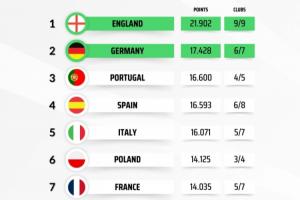 目前个联赛欧战积分方面,英超早已锁定前二,新赛季将有一个额外的欧冠名额,目前德甲积分暂时排名第二。