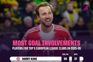 本赛季五大联赛球员参与进球榜:凯恩50球居首,姆巴佩43球次席